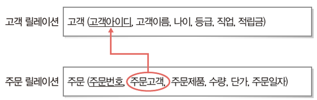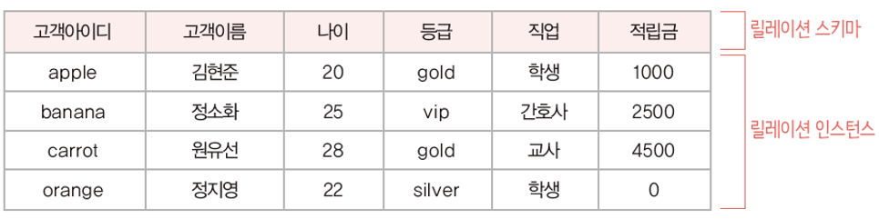 2. 릴레이션의 이름과 릴레이션에 포함된 모든 속성 이름으로 정의 ex) 고객(고객아이디, 고객이름, 나이, 등급, 직접, 적립금)