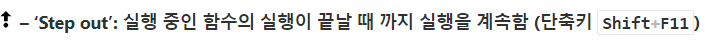 5. Step out(shift+f11): 실행 중인 함수의 실행이 끝날 때 까지 실행을 계속한다.
