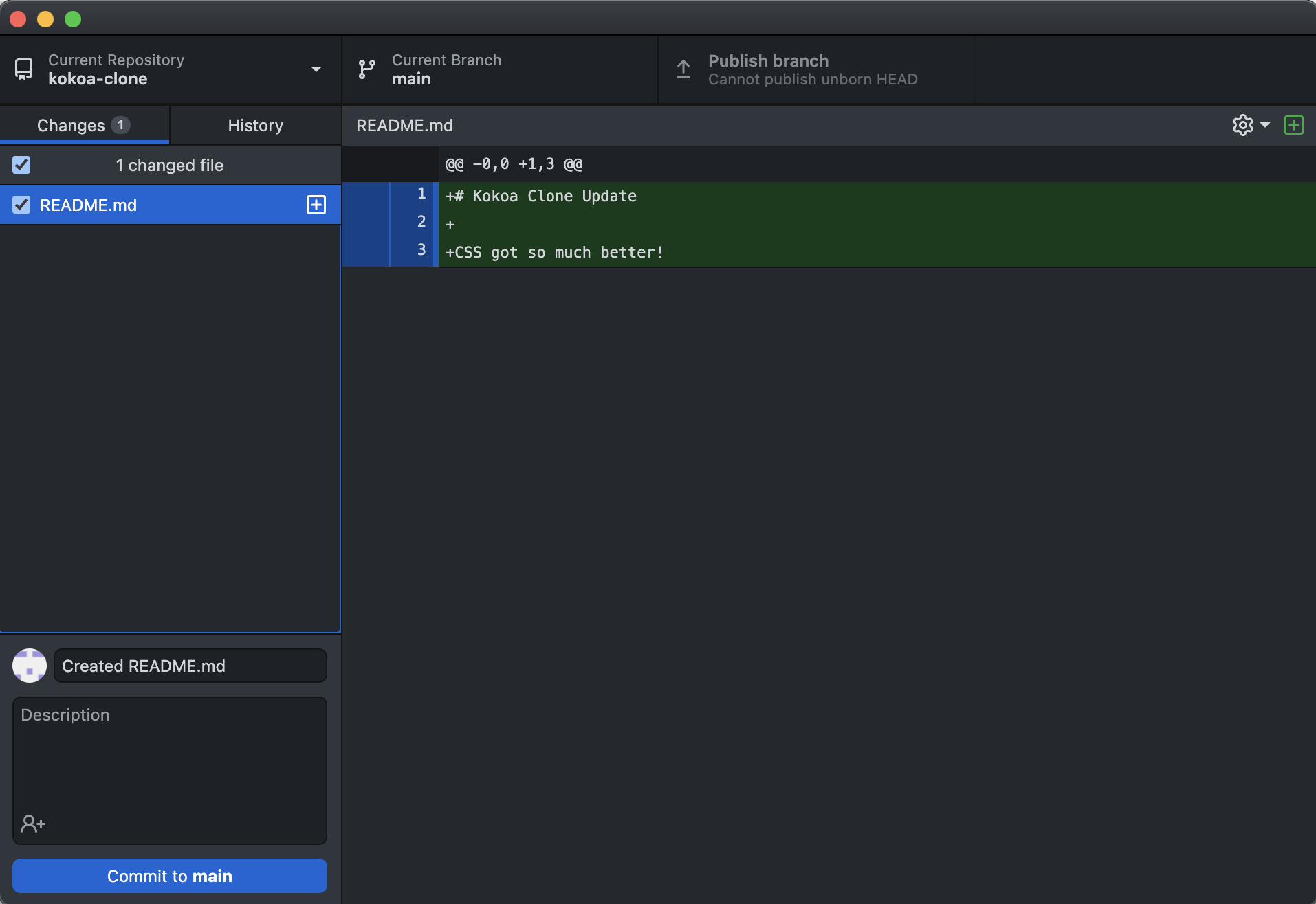 왼쪽 아래를 보면 커밋 타이틀을 적을 수 있다. 적고나서 Commit to main을 클릭하면 커밋이 완료된다. 그리고 오른쪽 위에 있는 Publish branch를 누르면 게시가 된다.