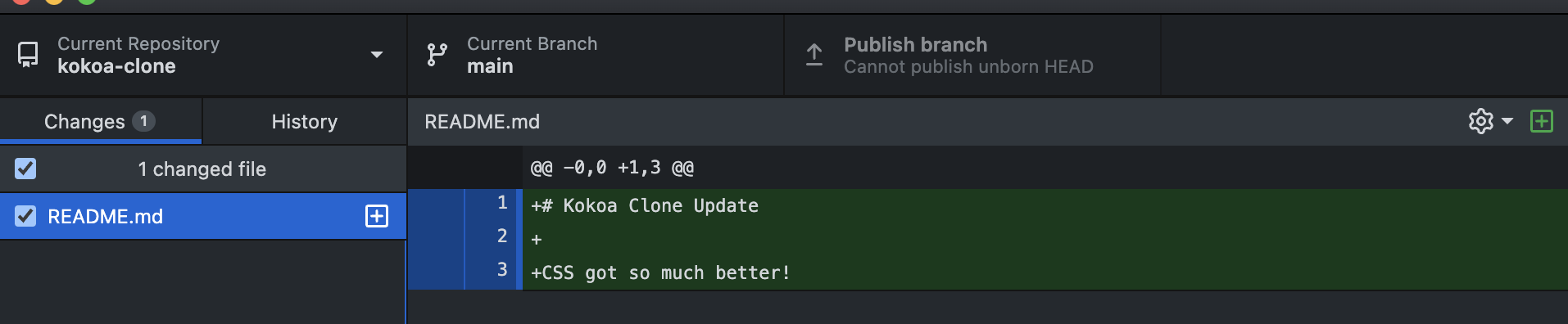그 후에 깃허브 데스크탑에 들어가면 이렇게 변경되어 있다. 변경한 파일이 완성되었으면 이제 파일을 publish(게시)한다. 그러기 위해서 커밋을 한다.
