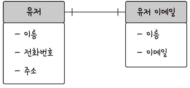 예를 들면 유저당 이메일은 한 개씩 있다. 이런 경우 1 : 1 관계이다. 1 : 1 관계는 테이블을 2개로 나눠서 테이블 구조 이해가 쉽다.