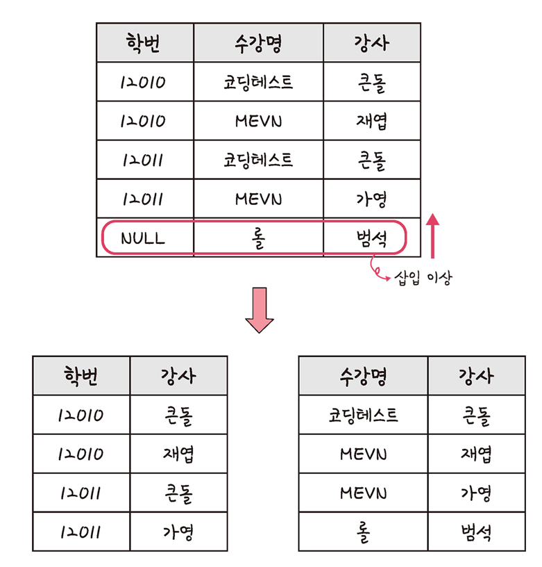 여기서 후보키는 {학번, 수강명} 혹은 {학번, 강사}가 후보키이다. 범석이는 학번이 NULL이라 문제가 된다.