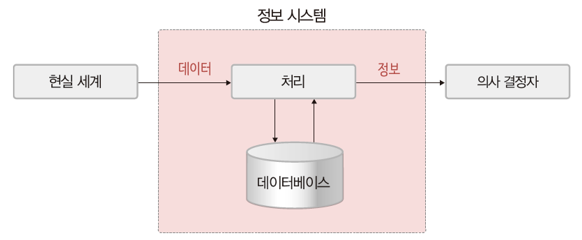 정보 시스템(information system): 조직 운영에 필요한 데이터를 수집하여 저장했다가 필요할 때 유용한 정보를 만들어 주는 수단