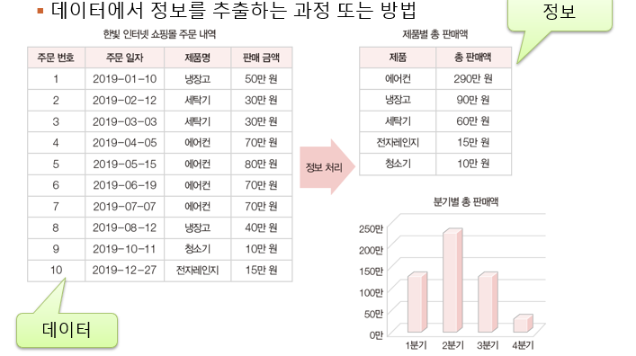 정보 처리(information processing): 데이터에서 정보를 추출하는 과정 또는 방법