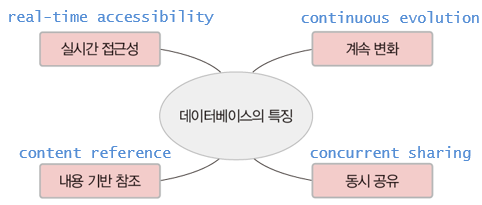 계속 변화: 데이터의 계속적인 삽입, 삭제, 수정을 통해 현재의 정확한 데이터를 유지