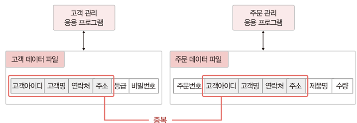 1. 같은 내용의 데이터가 여러 파일에 중복 저장 -> 데이터 중복성, 저장 공간의 낭비 + 일관성, 무결성 유지가 어려움