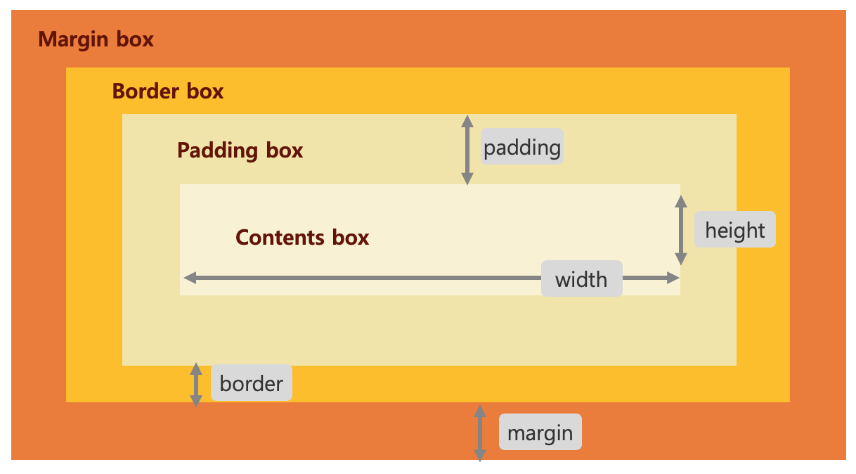 박스 모델: 테두리(border), 내용(content), 안쪽 여백(padding), 바깥쪽 여백(margin) 4가지로 구성