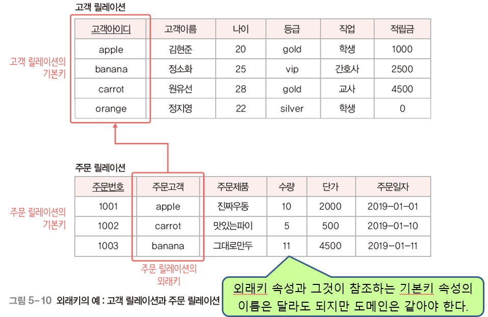 하나의 릴레이션에는 외래키가 여러 개 존재할 수도 있고 외래키를 기본키로 사용할 수도 있다.