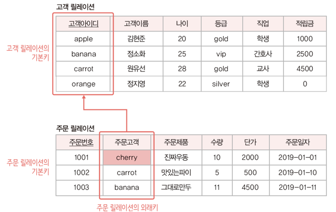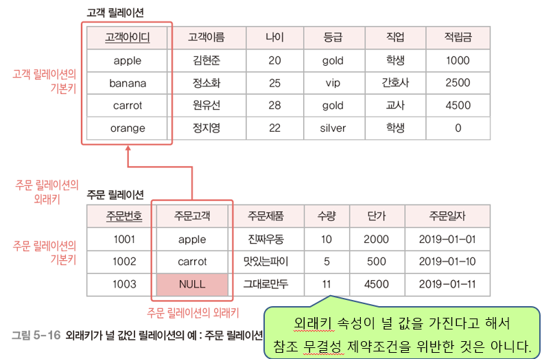 이 그림에서는 cherry라는 고객아이디는 존재하지 않기 때문에 참조 무결성 제약조건을 위반했다.