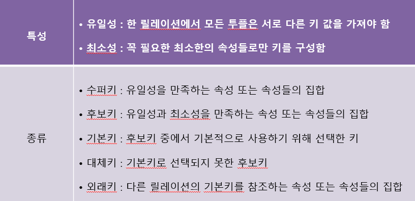 유일성(uniqueness): 하나의 릴레이션에서 모든 투플은 서로 다른 키 값을 가져야 함