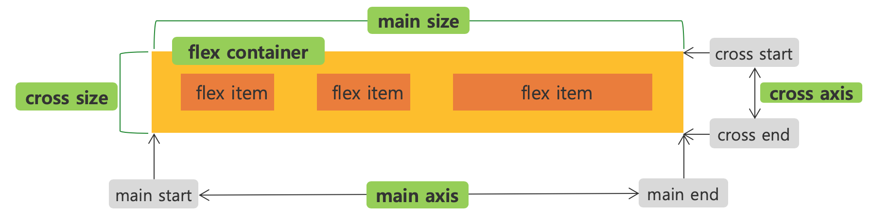- main axis: 메인 축으로 왼쪽에서 오른쪽으로 움직이는 inline 방향(역방향도 가능)