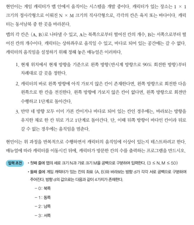 입력을 받고 북, 동, 남, 서 방향을 리스트로 저장한다. (북의 기준은 왼쪽이다) 그리고 왼쪽으로 회전하는 함수를 만든다. 그리고 count는 들리는 칸의 수이고 trun_time는 네방향 모두다 못가는지 체크하는 변수이다.