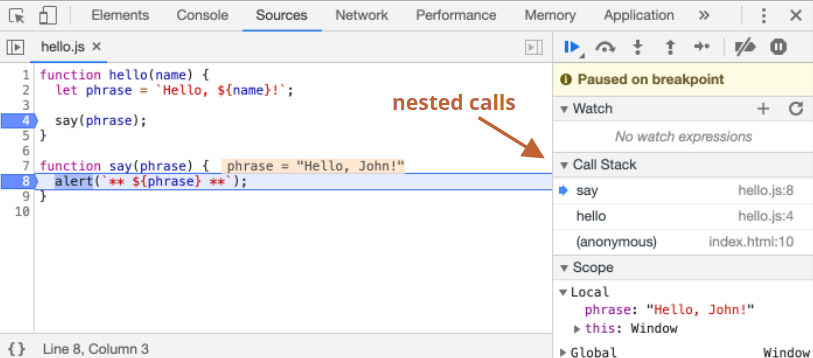 2. call stack: 코드를 해당 중단점으로 안내한 실행 역순으로 표시한다. hello 함수를 정의하지 않아서 콜 스택 하단엔 anonymous가 출력된다. 콜 스택 내의 항목을 클릭하면 디버거가 해당 코드로 움직인다.