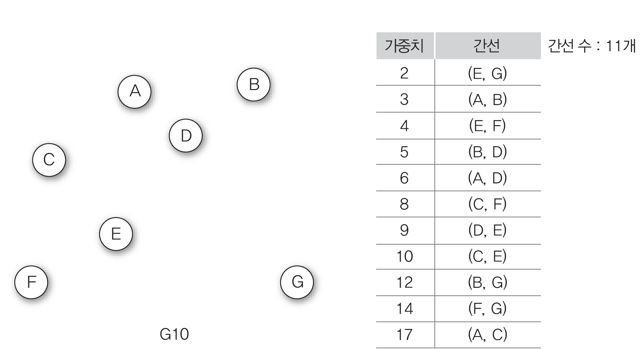 그래프 G10의 가중치에 따라 오름차순으로 정렬 -> 위에서 부터 간선의 수가 n-1이 될 때까지 삽입