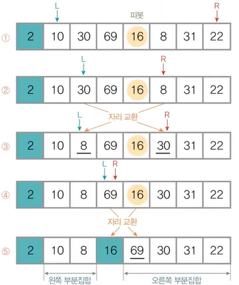 1. L은 왼쪽, R은 오른쪽에 두고 R을 왼쪽으로 움직이면서 피봇보다 작은 원소를 찾는다.