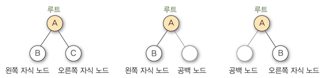 -이진 트리의 모든 노드는 왼쪽 자식 노드와 오른쪽 자식 노드만 가짐(공백 노드도 자식으로 취급)