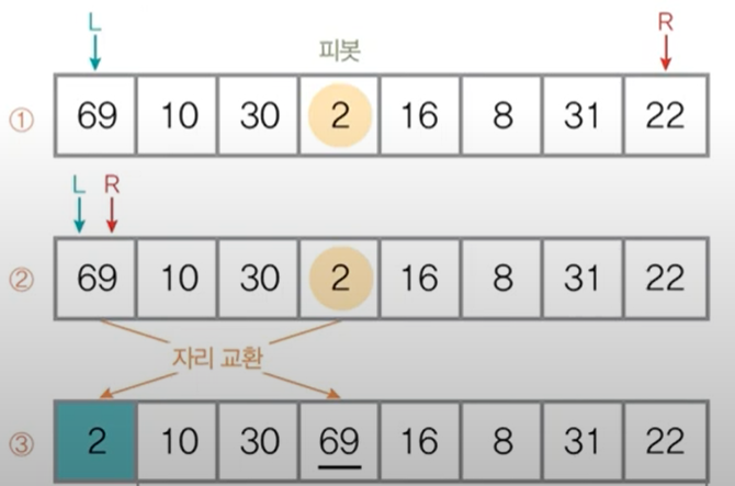 3. 피봇보다 작은 원소를 못찾아서 L과 R이 만나면 L, R이 있는 숫자와 피봇의 값을 바꿔준다.