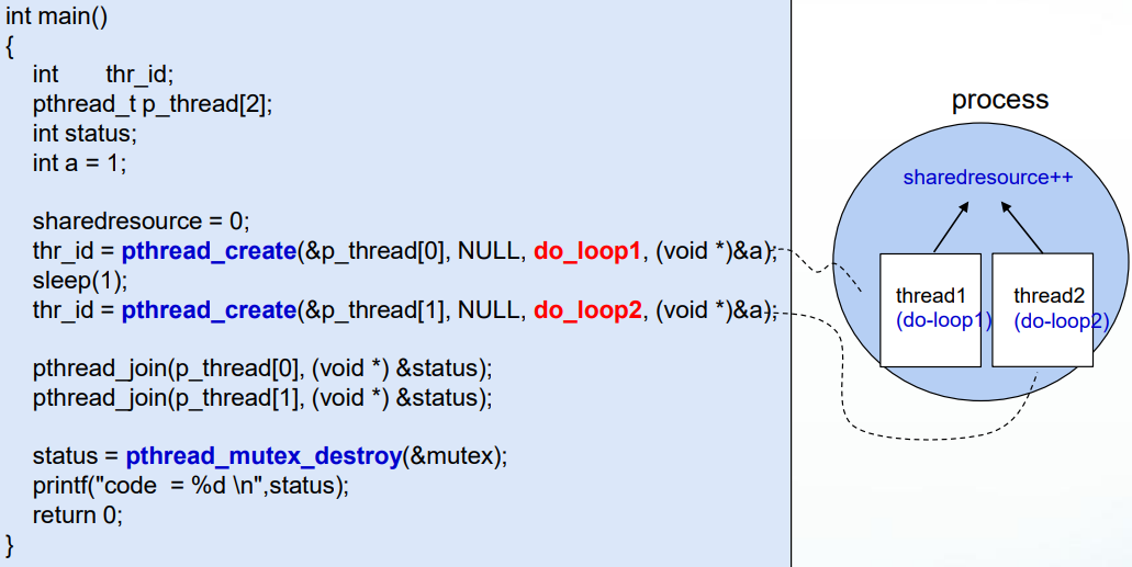 pthread_join 이건 두개가 동시에 돌다가 동기를 맞추는 경우에 join을 썼다. 만약 스레드1이나 스레드2중 하나가 먼저 끝나거나 안끝나면 join 프로그램이 일 시킨 2개의 일이 완전 끝나야지만 종료하도록 만들고싶다. 그러면 join 2가지를 걸어서 두가지 모두 끝나고 return 0;가 되도록한다.