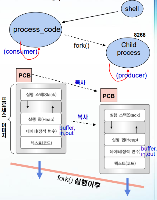 process_code가 fork로 자식 프로세스를 만들고 부모는 consumer역할 자식 프로세스는 데이터를 만드는 producer을 한다.