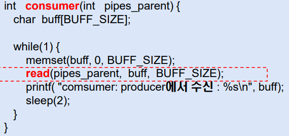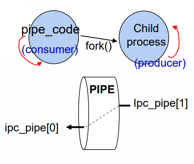 pipe라는 시스템 콜을 이용해서 파이프를 만든다. 이때 파이프를 지정해주는 변수가 들어갈 수 있다. 오른쪽 그림보면 프로듀서의 역할을 하는 자식은 송신용 파이프로 쓰고자하는것, 컨슈머는 수신용 파이프로 쓰고 싶다. 파이프는 방향성이 있다. 한쪽 방향으로만 간다. 다른쪽으로 보내고 싶으면 파이프를 하나 더 만들어야한다.