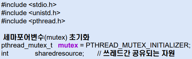 mutex는 헤더파일에 자료형으로 정의되어있다. mutex, 즉 세마포어 변수를 쓰고싶으면 자료형으로 변수를 사용하면되고 초기값을 상수로 선언해야한다. 상수는 헤더 파일에 저장