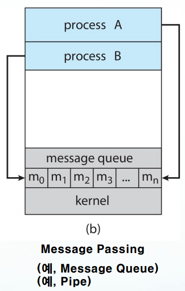 b, message라는 포멧을 만든다. 커널내부에 message queue 터널이 운영하는 공간이다. 만약 B가 A에게 보내고 싶은 메시지가 있다. 그러면 B는 메시지큐에다가 m0, m1 등등으로 저장하고 A가 읽어오는 방식이다. fifo이다.