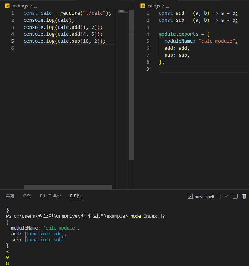 노드js에서는 calc.js에 있는 모듈을 index.js에서 내장 함수를 통해 불러와서 사용할 수 있다.