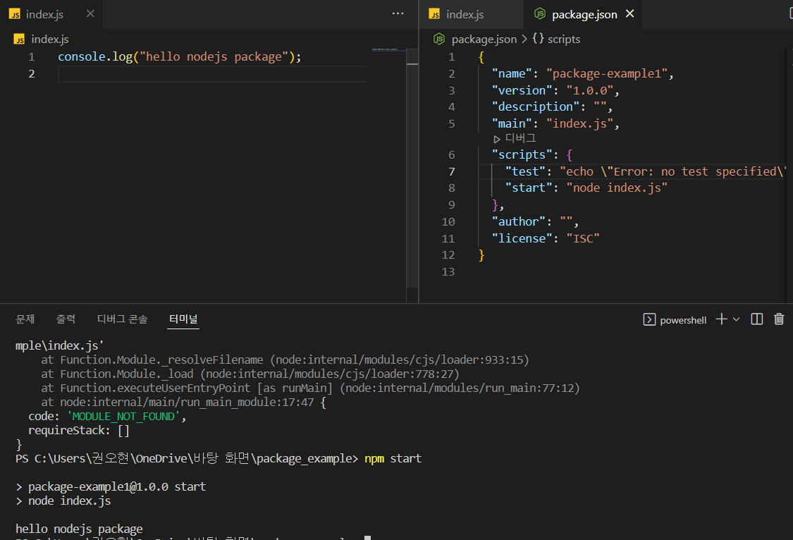 npm 명령어를 통해 package.json을 만들고 index.js를 실행했다.