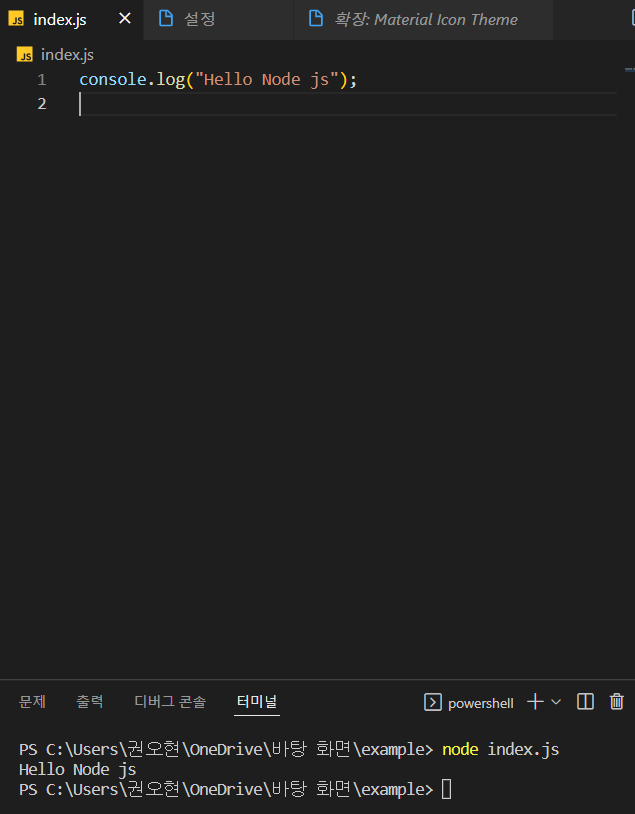 터미널에서 node 다음에 파일명을 입력하면 Node.js에서 실행이 가능하다.