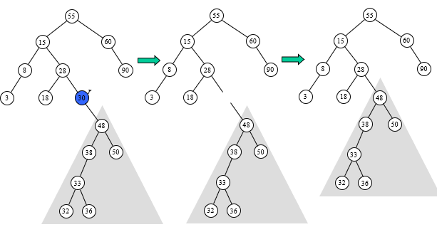 2. 이 ppt에서는 오른쪽 서브 트리를 택했다. 오른쪽 서브 트리는 가장 작은 것을 삭제된 자리에 넣어준다. 따라서 가장 작은 30을 선택하고 삭제된 자리로 보내준다.