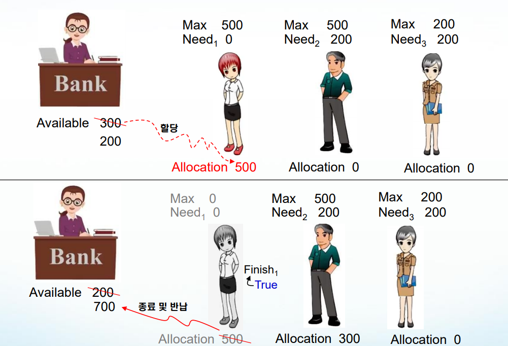 작으면 할당해줄 수 있다. 실행하고 종료되면 finish는 true 그리고 자원 반납