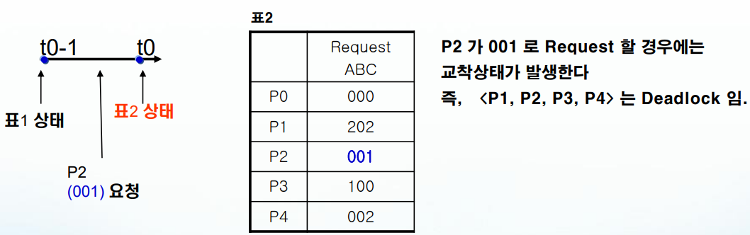 따라서 p0만 종료되고 나머지 프로세스는 자원을 기다린다. 데드락이 발생 p1,p2,p3,p4가 데드락이다. 이렇게 데드락을 탐지한다.