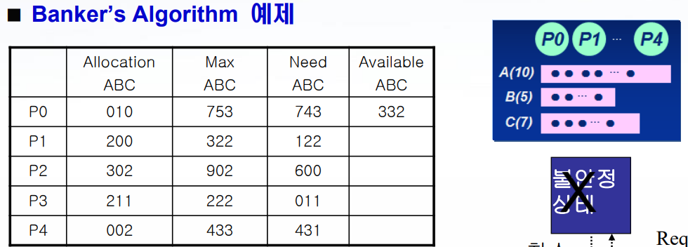 resource 타입이 A B C 총 3개 이다. <p1, p3, p4, p2, p0> 순으로 실행하고 allocation 할당 받은 개수, max는 최대 필요 개수, need 필요한 개수, available는 남아있는 잔여량