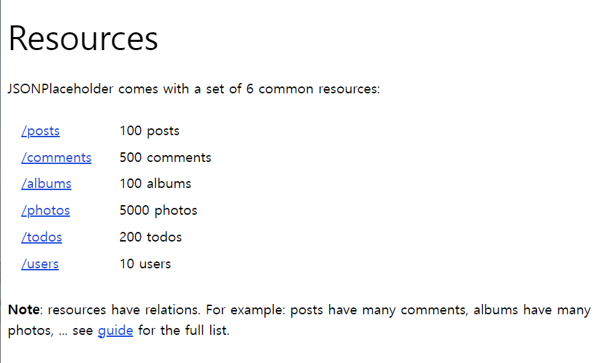 여기에는 어떤 API 서비스로 자원을 가져다가 쓸 수 있는지 리스팅을 해놨다. 이중에서 comments를 사용했다.
