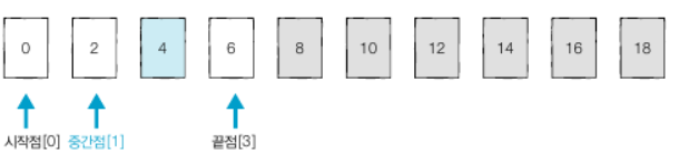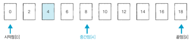 이진 탐색은 시작점, 중간점, 끝점 3개의 변수를 사용한다. 찾으려는 데이터와 중간점 위치에 있는 데이터를 반복적으로 비교해서 원하는 데이터를 찾는다.