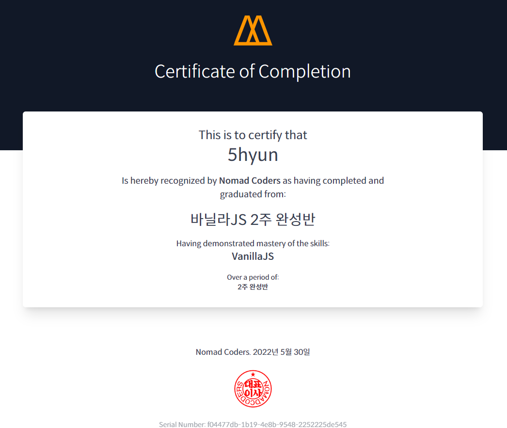 처음으로 js를 통해 무언가 만들어봤다. 아직 초라하지만 이 강의와 챌린지를 기반으로 리엑트를 공부하는 등 탄력을 받고 있다.