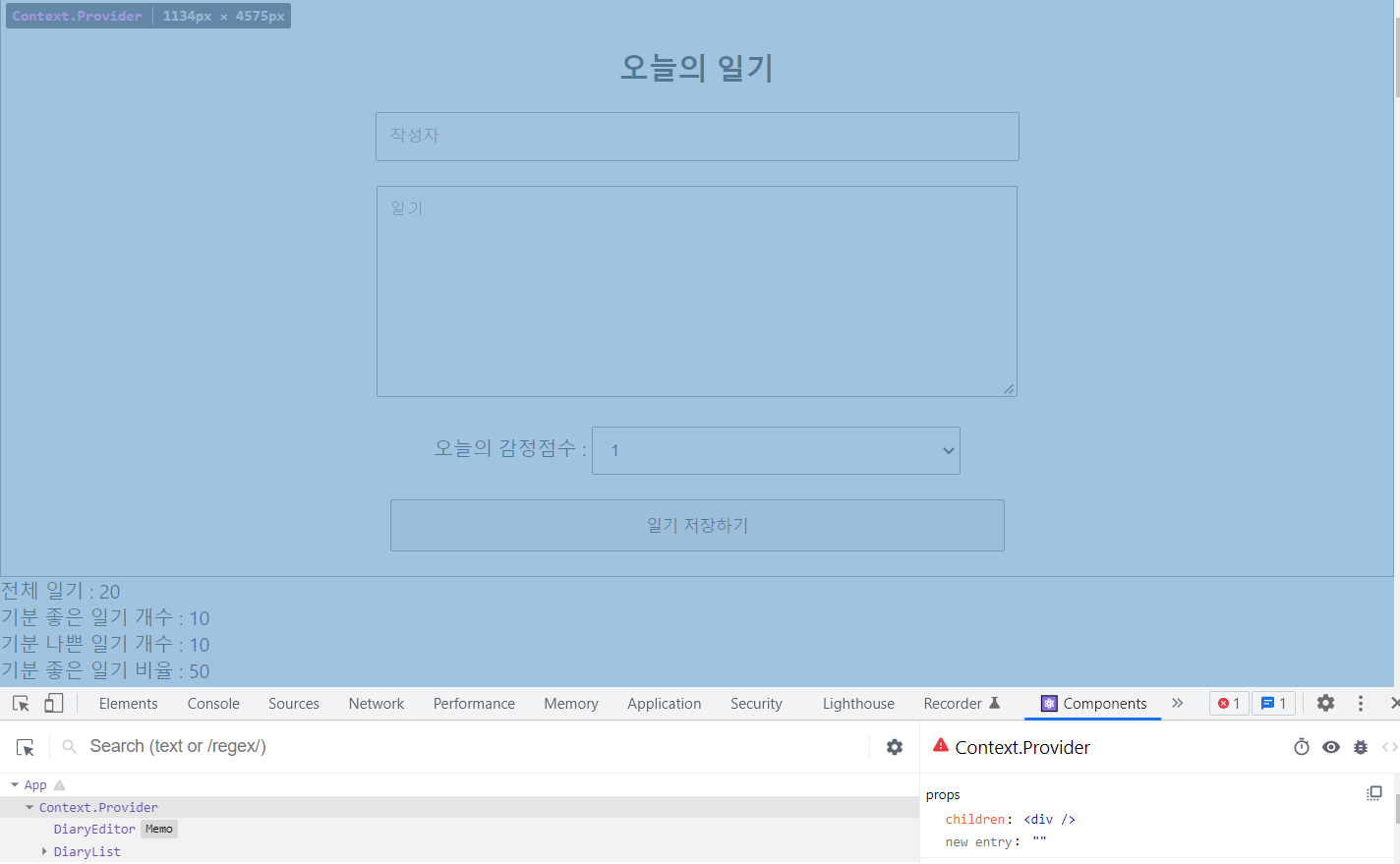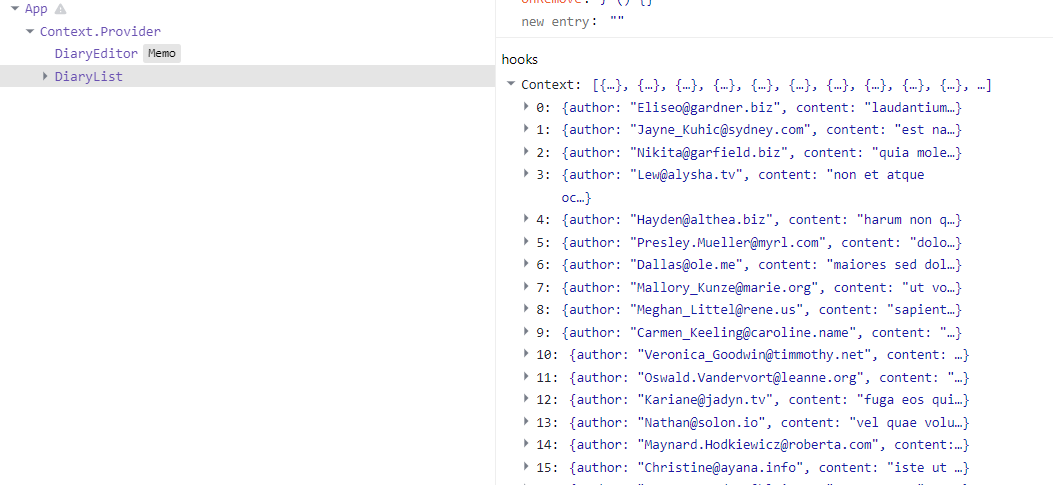 그리고 보면 hooks의 Context에 일기 데이터들이 잘 전달된 것이 보인다.