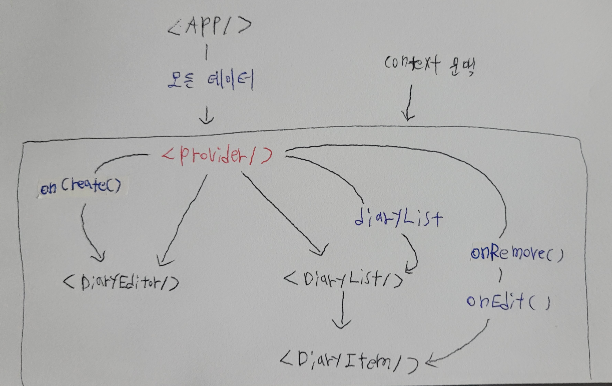 <DiaryEditor />과 <DiaryList />는 더 이상 onCreate, onRemove, onEdit이 함수들을 전달 받을 필요가 없어져서 제거한다.