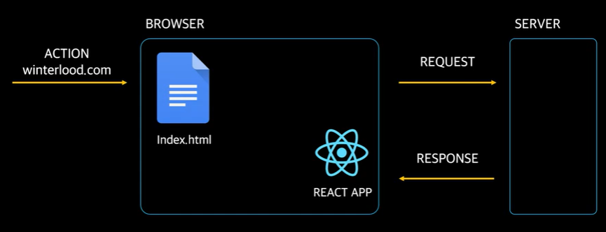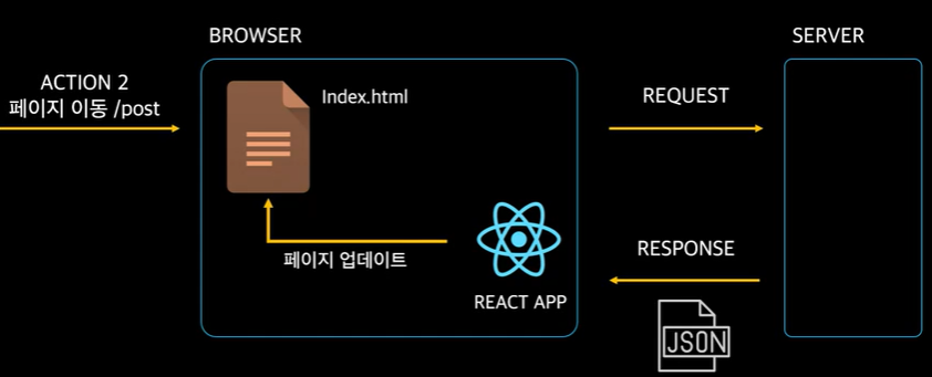 리엑트는 페이지가 1개라서 더 이상 서버에서 가져올 수 없다. 대신 서버가 아니고 리액트 앱이 알아서 페이지를 업데이트 한다. 브라우저가 알아서 처리하면 되니까 서버랑 통신하는 시간 없이 빠르게 전환할 수 있다. 그 외의 필요한 데이터들만 서버를 통해 가져온다.