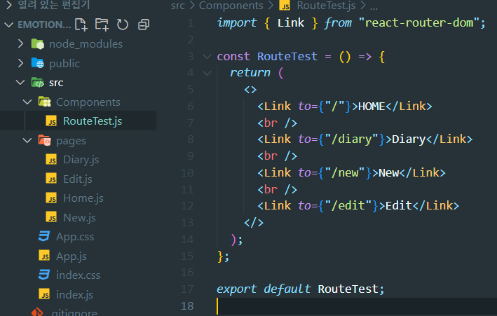 Components 폴더를 만들고 그 안에 RouteTest.js를 만든다.