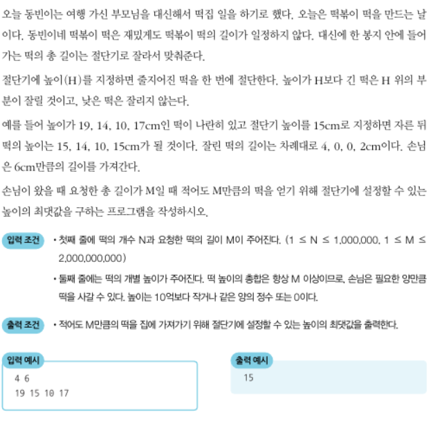 이 문제 풀이는 절단기 높이를 반복해서 조정하는 것이다. 당연한 말이지만 절단기 높이는 0부터 가장 긴 떡의 길이 안에 있어야 한다.