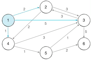결국1번 노드에서 출발했을 때 2번, 3번, 4번, 5번, 6번 노드까지의 최단 경로가 각각 2, 3, 1, 2, 4라는 의미이다.