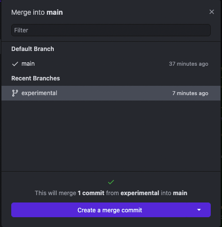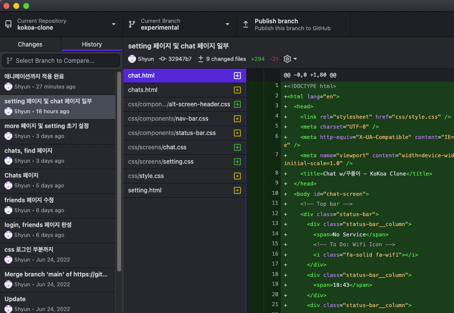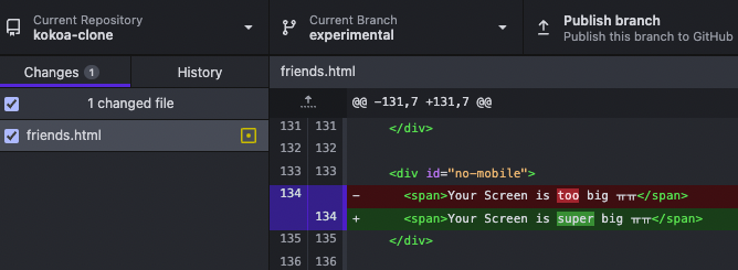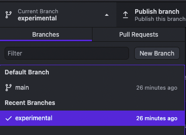 깃허브 데스크탑에서 experimental이라는 새로운 branch를 만들어준다.