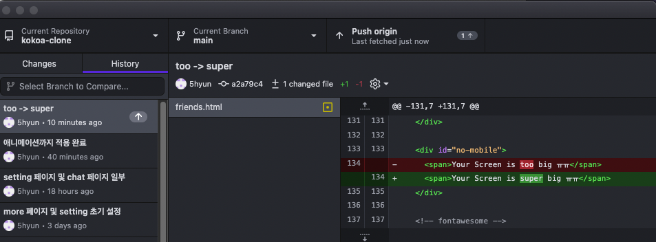 그리고 단어를 바꿔보니까 experimental branch에 변경된 내용이 보인다. 그리고 커밋을 하면 experimental의 history에만 보이고 main의 history에는 보이지 않는다.