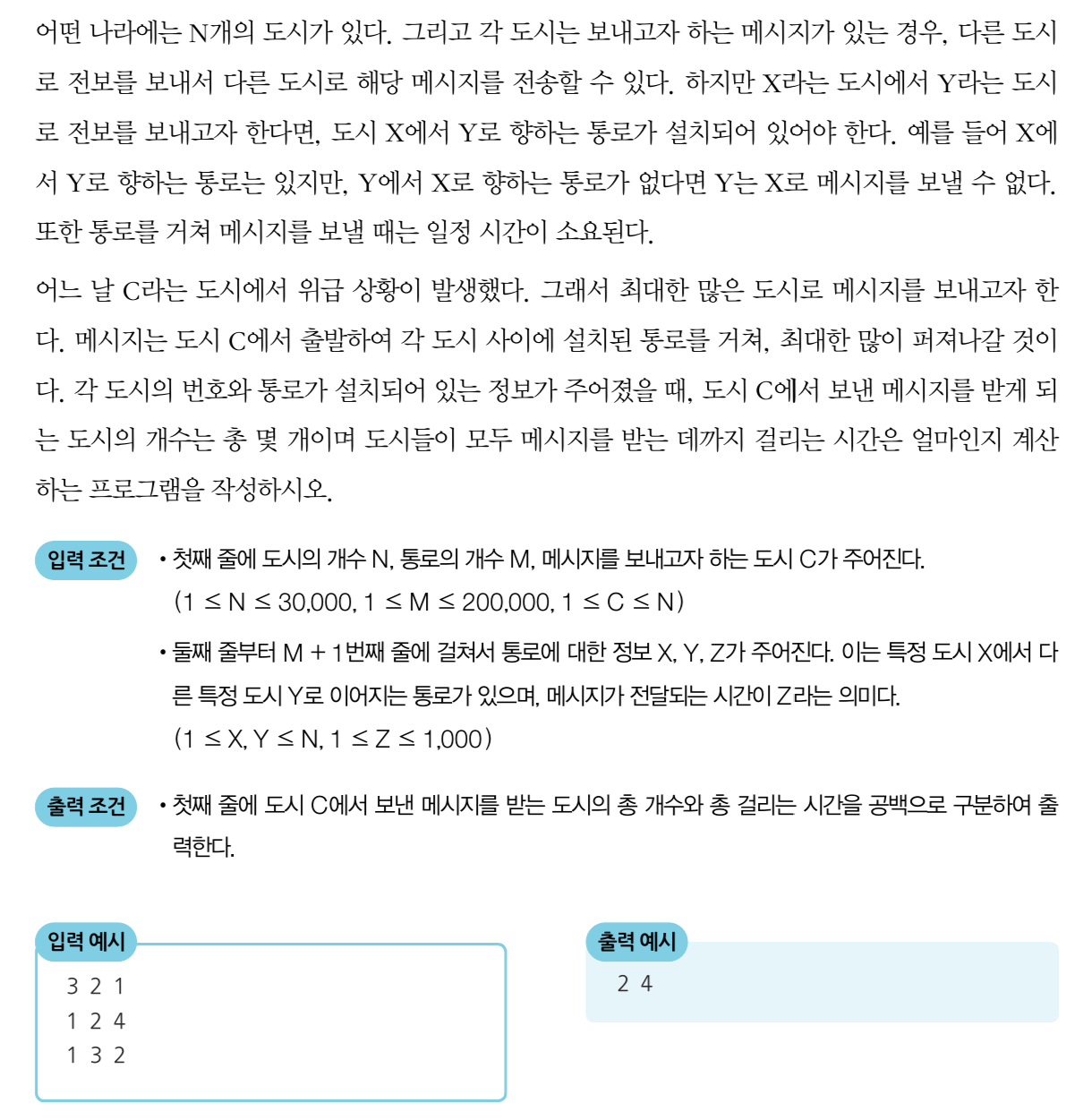 내 풀이는 플로이드 알고리즘을 활용해서 먼저 그래프를 만들었다. 그리고 출발 노드인 지점에서 몇 개의 노드가 연결되어 있는지 확인하고 가중치가 가장 긴 시간의 노드의 값을 구하면된다.