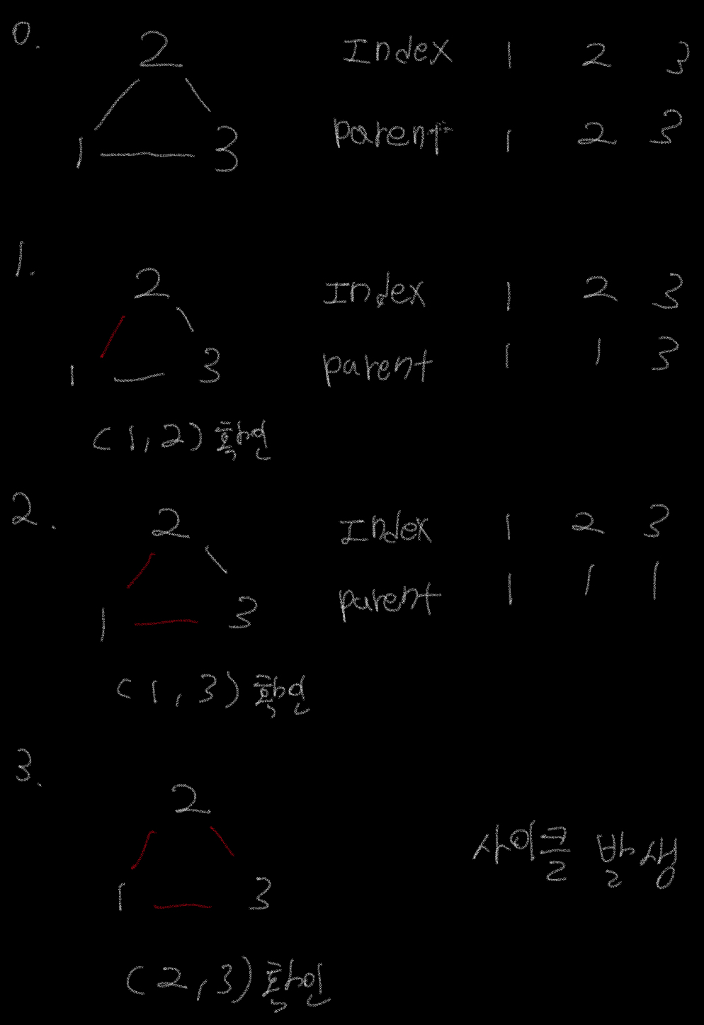 모든 간선을 돌면서 union 연산을 해주고 cycle 변수를 둬서 사이클이 발생해주면 종료한다.