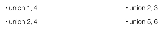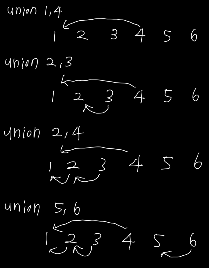 이렇게 4개의 union 연산이 있다. 1과 4는 같은 집합, 2와 3은 같은 집합, 2와 4는 같은 집합, 5와 6은 같은 집합 이런 의미이다.