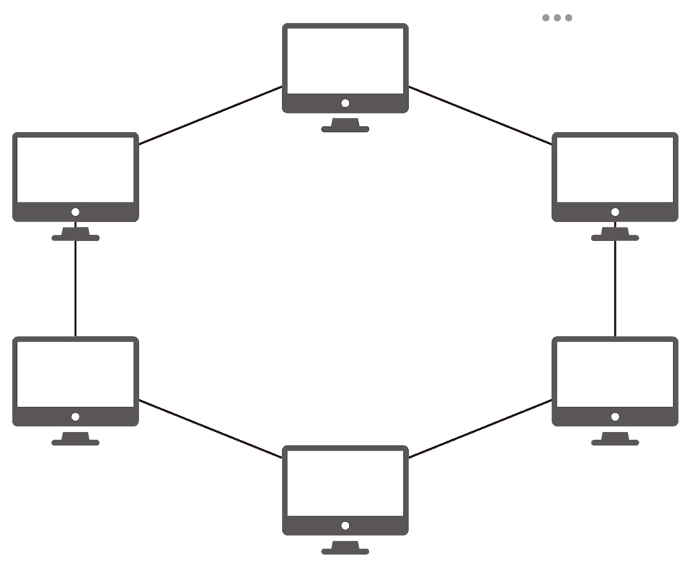 링형 토폴로지는 고리처럼 연결하여 통신을 하는 망 구성 방식이다. 각 노드는 고리 모양의 길을 통해 패킷을 처리한다.