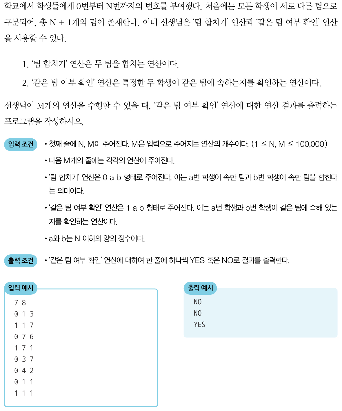 문제를 보고서 이 문제는 경로 압축으로 루트 노드를 찾는 함수를 팀 합치기 연산으로 사용한다. 그리고 루트 노드가 같은지 판단하는 함수를 같은 팀 여부 확인으로 풀었다.