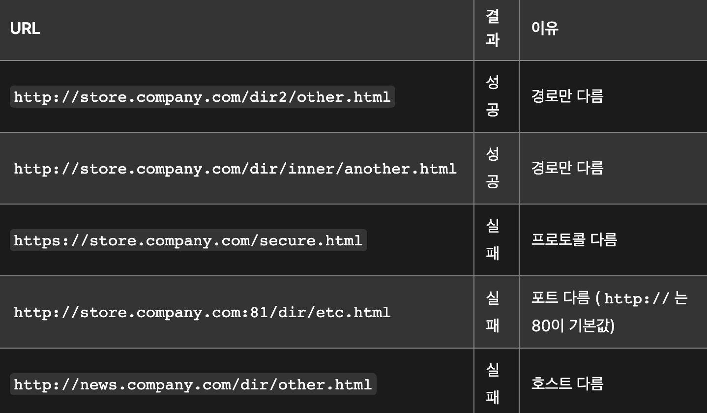 두 URL의 프로토콜, 포트(명시한 경우), 호스트가 모두 같아야 동일한 출처이다.